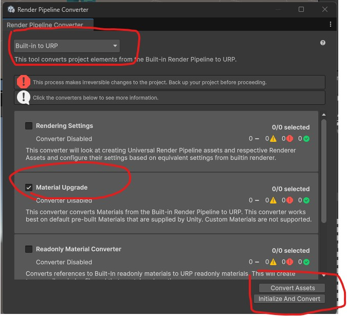 メニューバーから Window > Rendering > Render Pipeline Converter